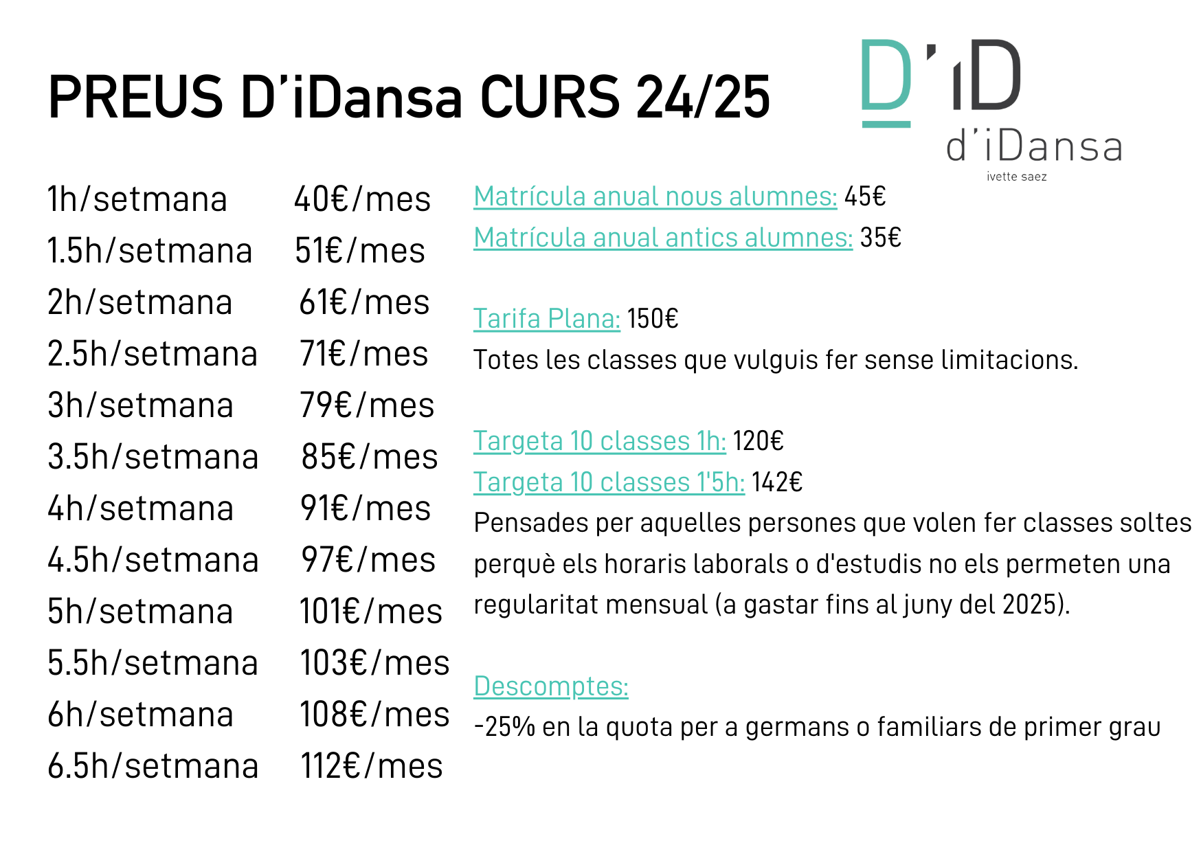 Els preus de D’iDansa depenen de les hores setmanals que realitzi cada alumna, com més classes es realitzin a la setmana més econòmic surt la hora de classe.